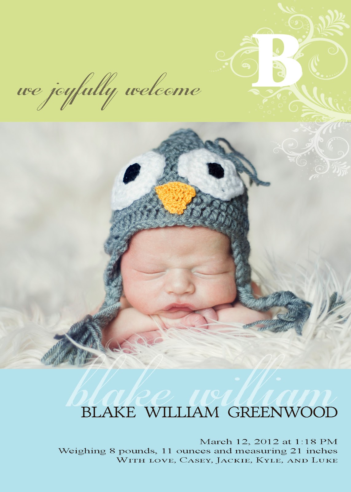 Baby Blake William Greenwood was born on Monday March 12,2012. He weighed 8lbs. 14oz. 21 inches long! We are so blessed to have him in our lives. We love him very much!
